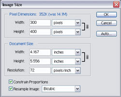 Since this tulip photo was from my digital camera, it was a whopping 1920×2560 pixels. If your image is a lot bigger than the size of the final Web image that you want to create, click on “Image,” then select “Image Size,” and specify a new width and height for your image. I resized my image to a workable 300×400 pixels.