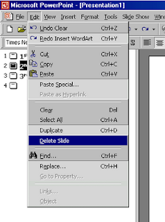 Ada beberapa cara untuk menghapus slide, pilih slide yang akan dihapus dengan klik pada gambar kotak kecil disamping kiri yang tampilan kemudian klik gambar gunting atau klik menu “edit” lalu “delete slide”. Cara lain adalah dengan memilih slide yang akan dihapus lalu tekan tombol delet/del pada keyboard.