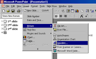 Untuk memnambahkan WordArt pada presentai anda dapat dilakukan dengan cara klik “Insert” lalu “Picture” kemudian “Word Art” seperti pada gambar.